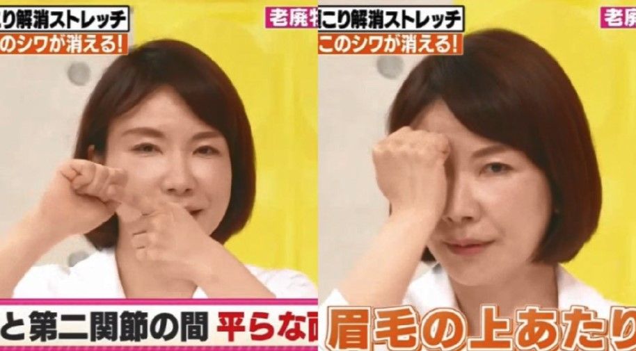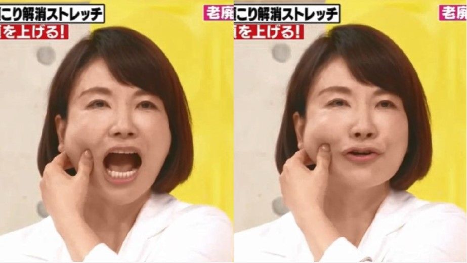 用大拇指按著右邊臉頰,大約是顴骨下方的位置,之後三根手指大力捏著臉頰。面部望向前方,下巴不地張合。這個動作可以幫助皮膚排出廢物,讓皮膚回復彈性,有效抗衰老。