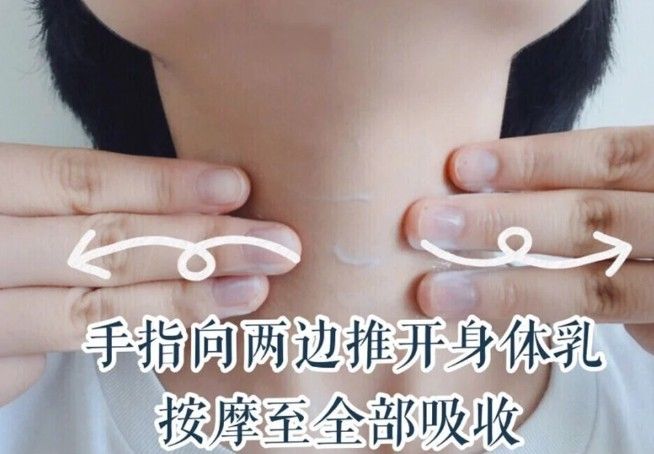 凡士林差不多完全吸收之後,再厚塗一層乳液,單純補濕或功能性的乳液都可以,這次利用雙手三指水平地將乳液推開,輕輕按摩頸項約15下。