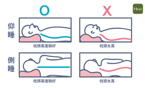 枕頭太高容易導致頸部向下對摺,引致頸紋出現,而枕頭太低也不利於頸椎健康。正常情況下,成人的枕頭應該高於8cm但不超過15cm,市面上大部分護頸枕、護椎枕的高度為11-12cm。 想找到專屬於你的合適枕頭,可以按公式計算:(肩寬-頭寬)÷2 ,更簡單的原則是:習慣仰臥的人,其枕頭的高度應該與你的拳頭高度一致;習慣側睡的人,其枕頭高度與右邊肩寬或右邊肩寬的長度一致。枕頭不會過高、不會過低,是預防及消除頸紋及肩頸痛的關鍵!